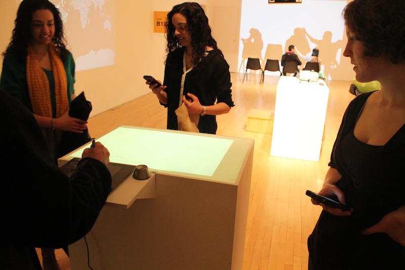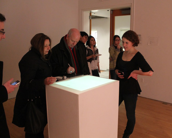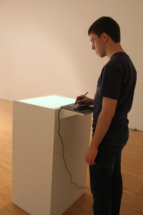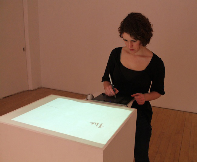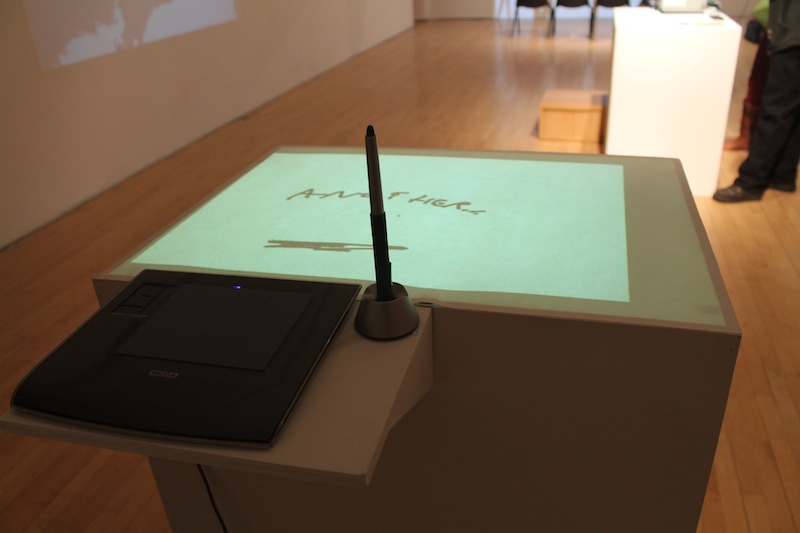 Anyone Home is an interactive installation, made in collaboration with Jason Wright, featuring a box that can be drawn or written upon. After a visitor creates a drawing or message, it is erased and a response appears.