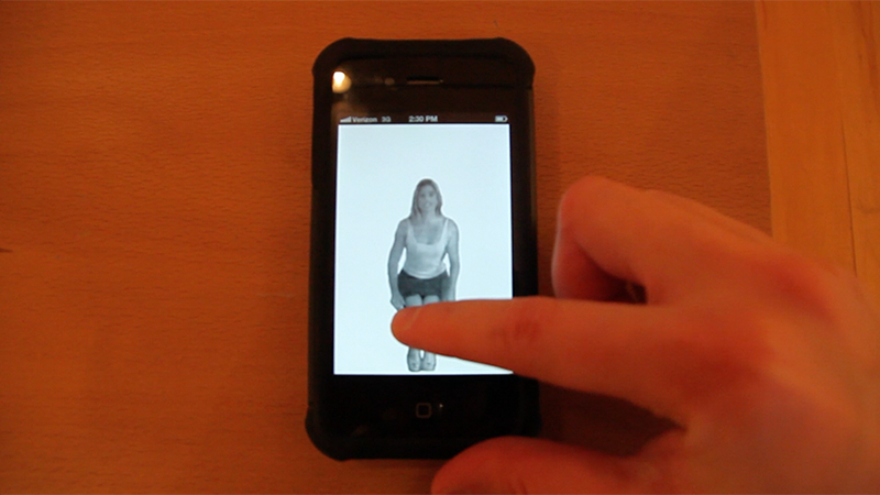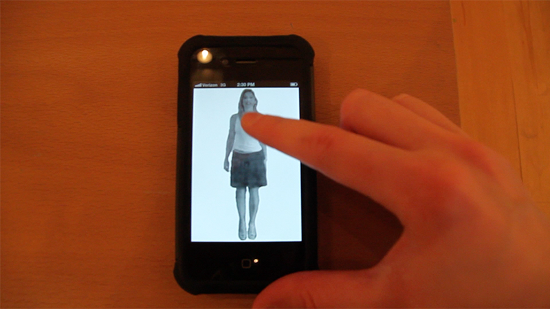 Stand is shown on a touch-screen phone and features an animated figure that responds to a downward dragging motion. It highlights the user's physical interaction with their device by complicating their relationship to the character onscreen. While the gesture may appear benign in another context, in Stand it seems voyeuristic, sexual, and even violent. Stand ultimately creates a complicated scenario where one is hyper-aware of their gesture and physical interaction with a digital avatar.