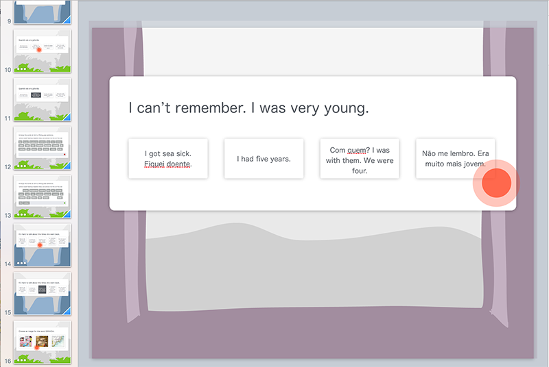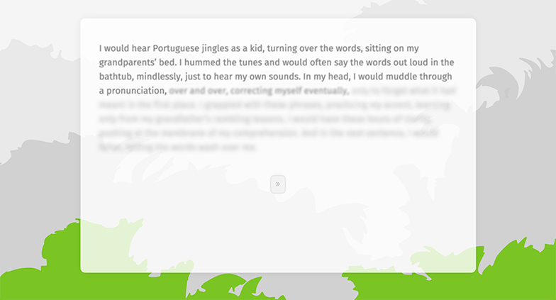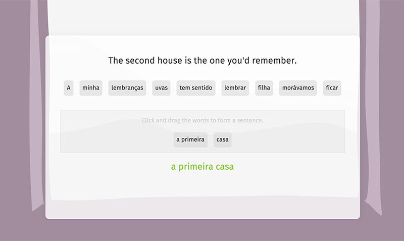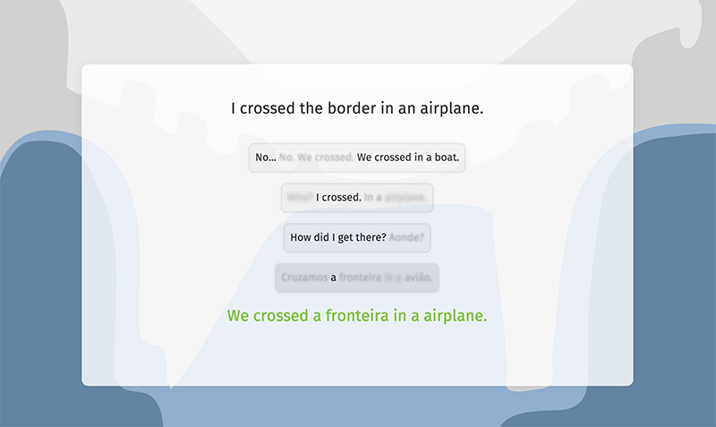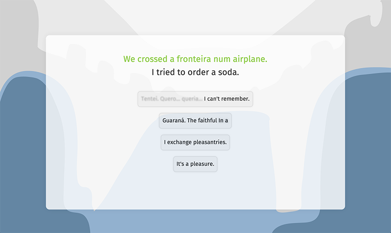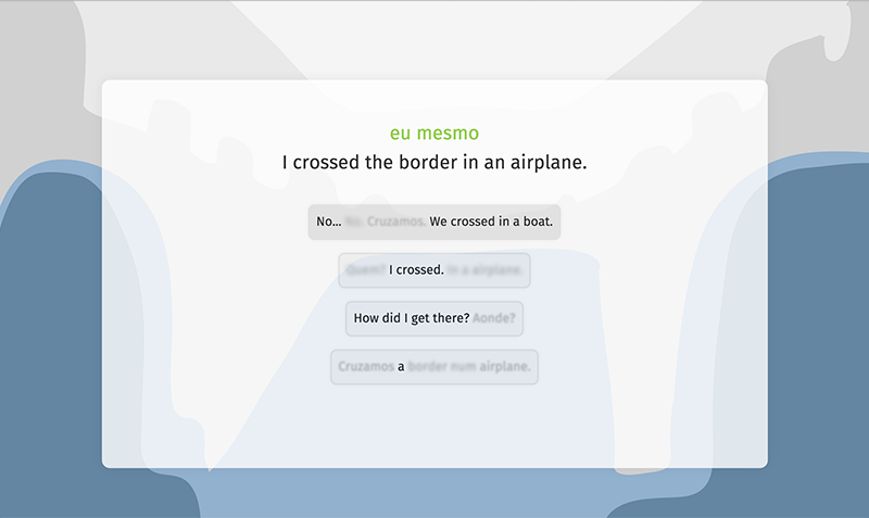 "We Arrived // Chegamos" is a web based interactive fiction that investigates notions of Diasporic identity and translation through the appropriation of the structure and aesthetics of language learning software.